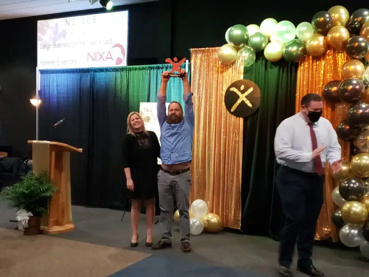 Xtreme Exteriors NIXIEs award banquet holding trophy above head large